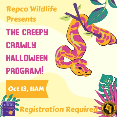 REPCO Wildlife Encounters will return to the library on Monday, October 13, at 11:00 AM for REPCO Wildlife Presents The Creepy Crawly Halloween Program! See real snakes, lizards, turtles, frogs, toads, scorpions, roaches and tarantulas! Learn about these amazing animals during this all-ages interactive program! If you’d like to attend REPCO Wildlife Presents The Creepy […]