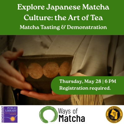 Explore Japanese Matcha Culture: The Art of Tea – Matcha Tasting and Demonstration will be held at the library on Thursday, May 28, at 6:00 PM.