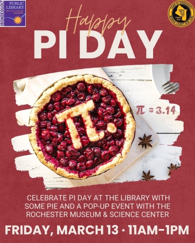 Pi Day is held every year on March 14th, but we’re excited to Celebrate Pi Day at the library on Friday, March 13, from 11:00 AM until 1:00 PM, with a fun pop-up event in partnership with the Rochester Museum and Science Center (RMSC). Families and students are invited to stop by and explore hands-on math activities, quick demonstrations about the meaning of pi (π), and interesting facts about how this famous number connects to everyday life.