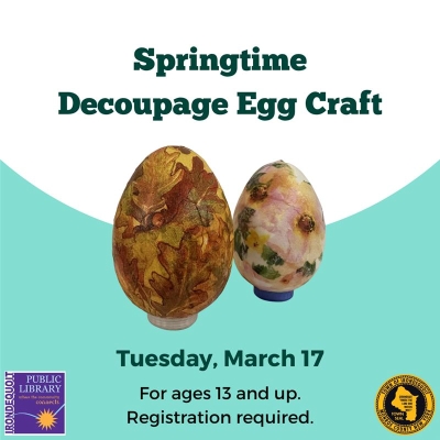 The Springtime Decoupage Egg Craft is designed for teens and adults, and will be held on Tuesday, March 17, at 6:30 PM. If you’d like to attend, please register now through our Event Calendar.